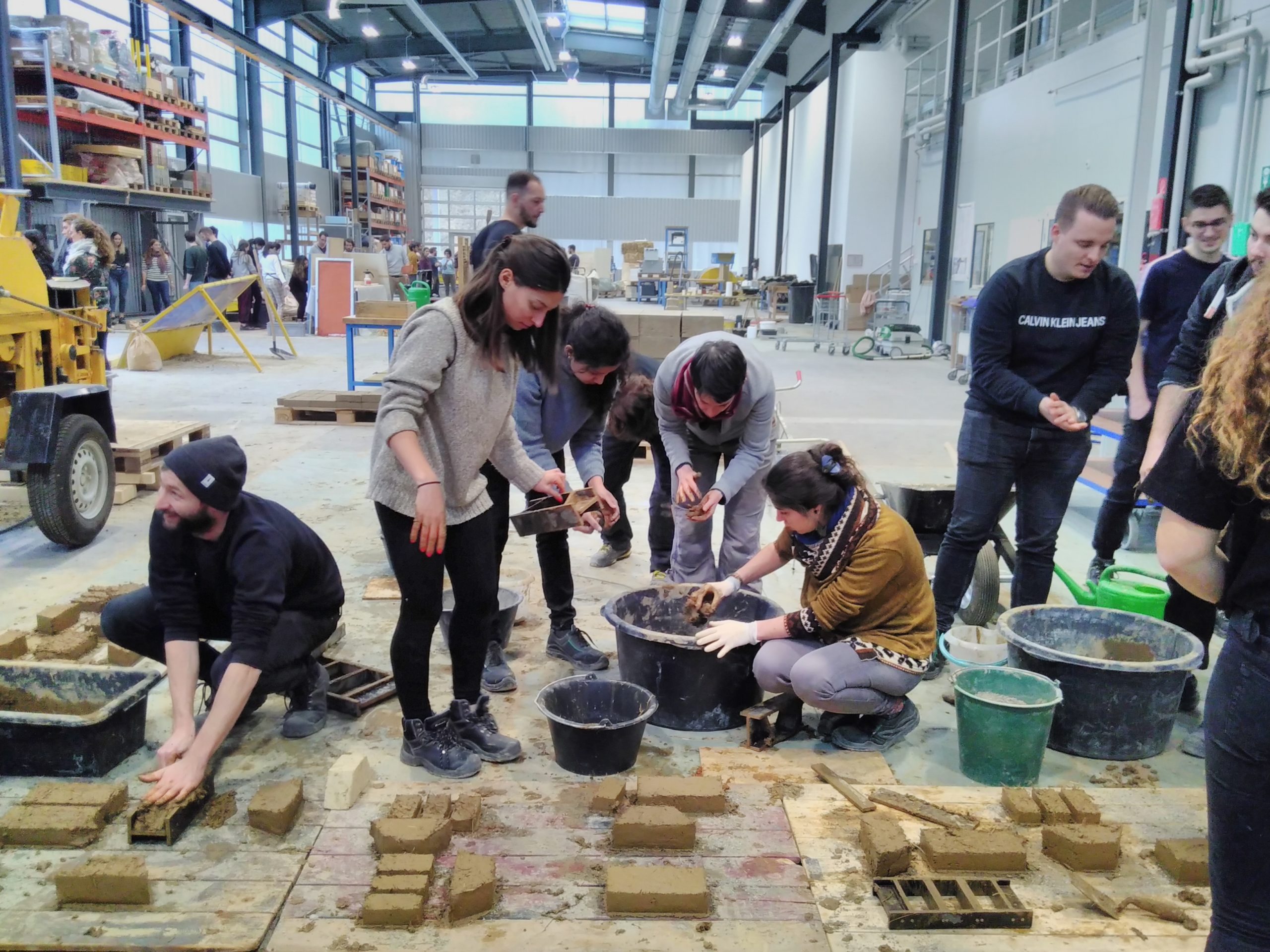 séminaire pratique sur la construction en terre pour les étudiants en master architecture des hautes écoles BFH, HEIA-FR, HEPIA et HEAD à la halle Pop-Up à Fribourg. etceterra assiste Terrabloc pour l’encadrement des étudiants.