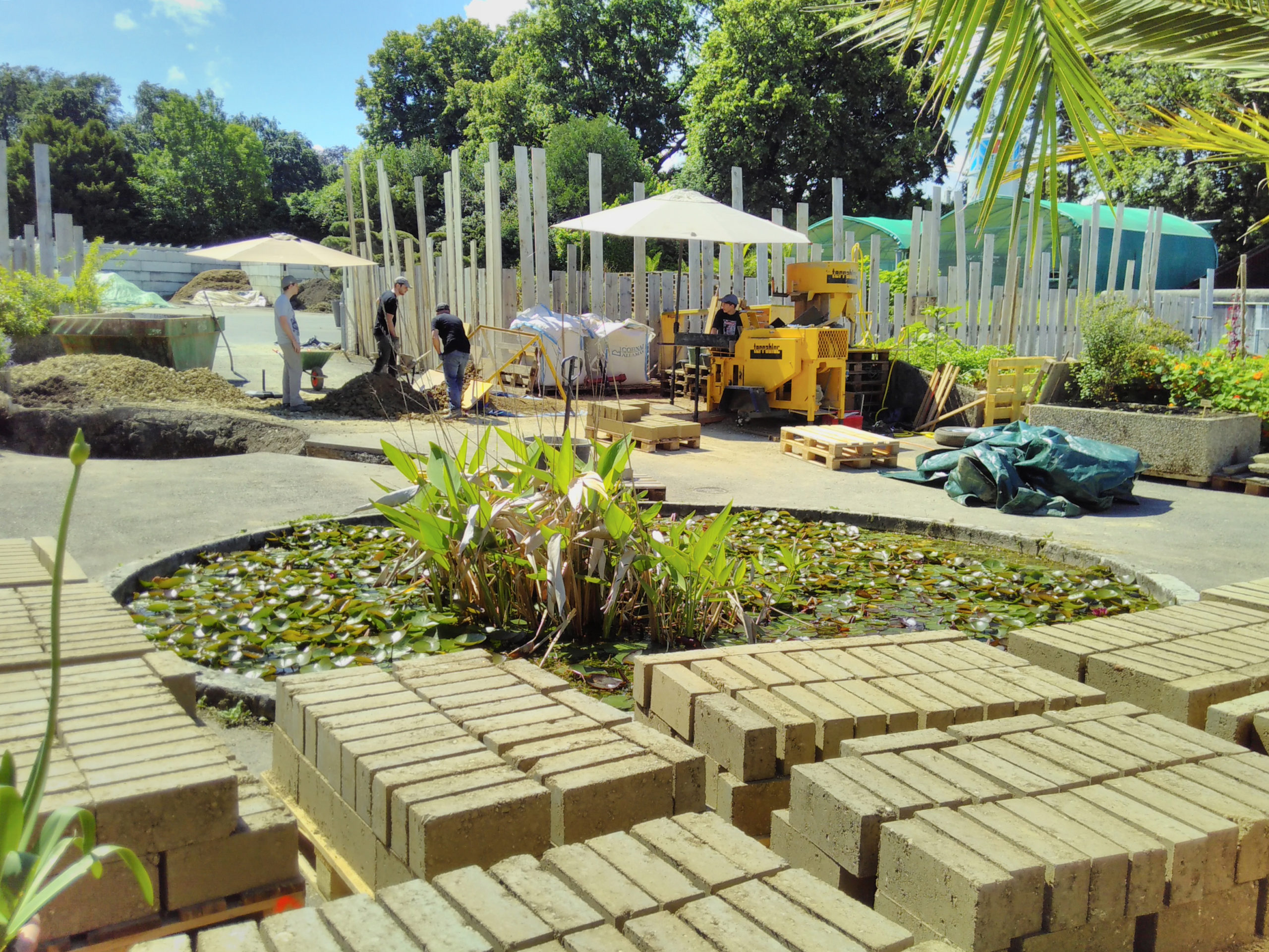 Production de briques de terre compressées (BTC) au théâtre de l’Orangerie à Genève avec l’entreprise Terrabloc. Les BTC composeront la termitière imaginée par l’artiste Séverin Guelpa.