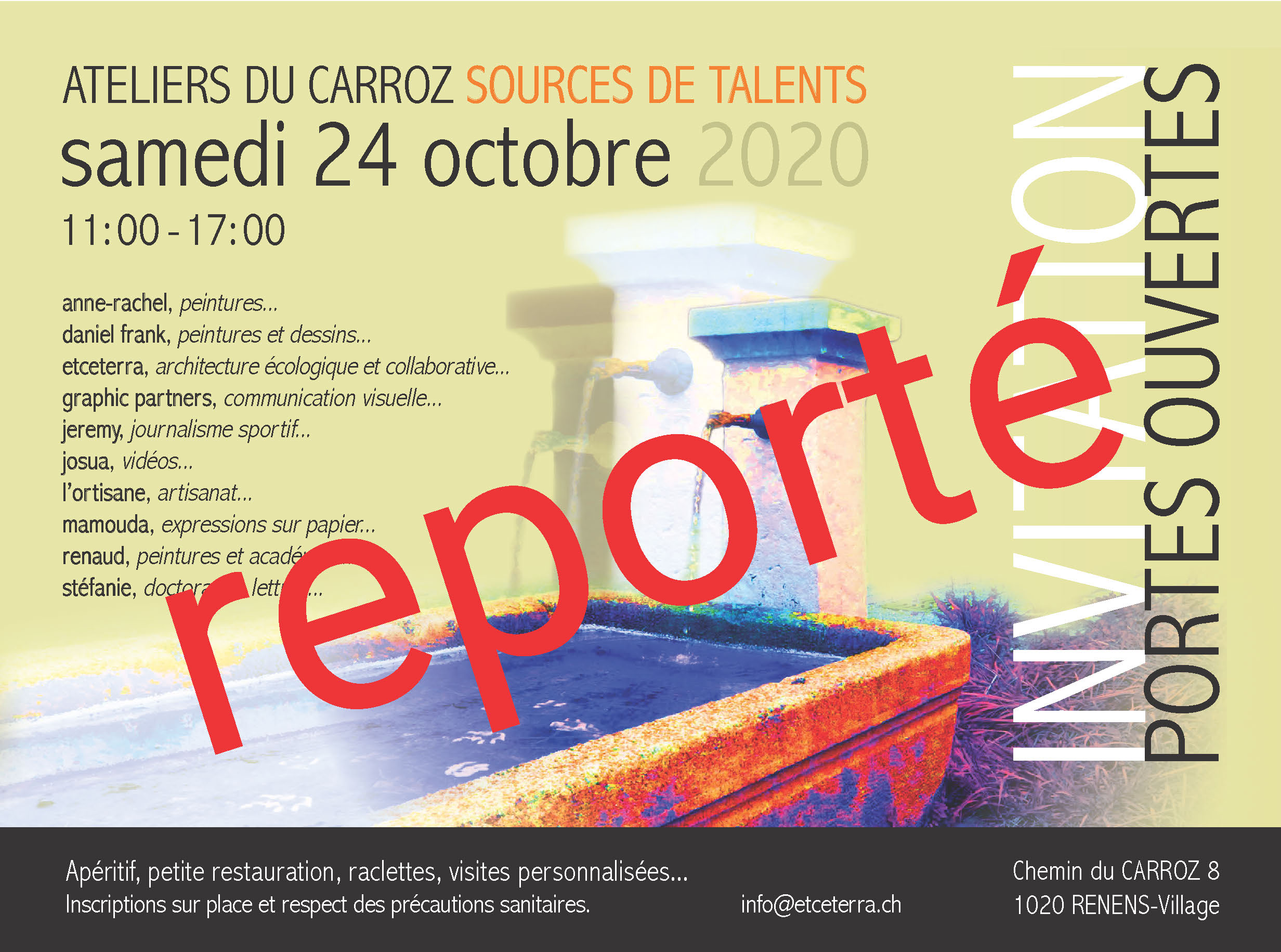 suite aux récentes évolutions de la pandémie et des prescriptions, nous, avec les artistes des ateliers du Carroz avons décidé d’annuler les portes ouvertes. Ces moments de partage que nous souhaitons conviviaux et détendus sont reportés à des jours meilleurs.