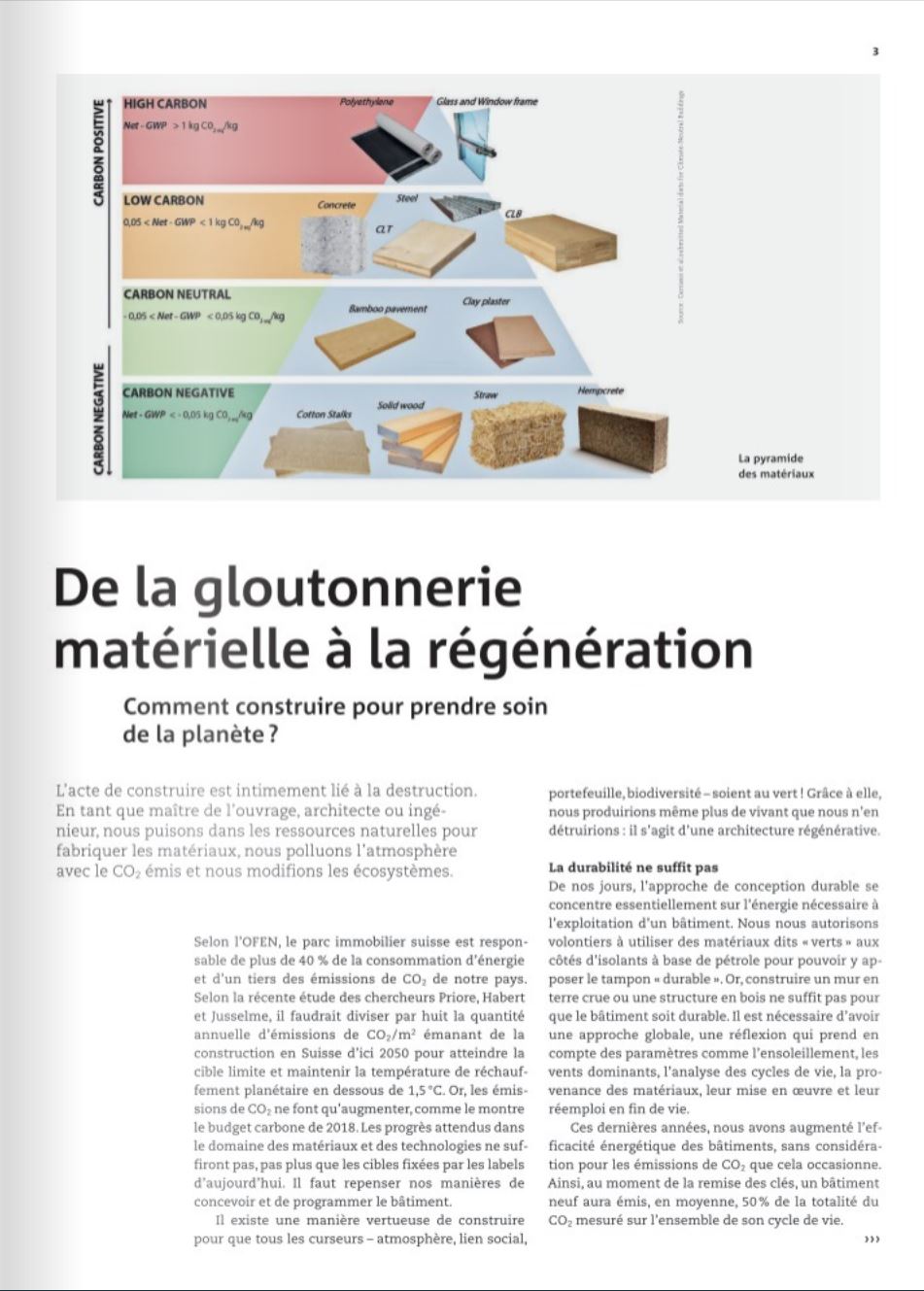 Un bâtiment régénératif restaure et renouvelle ses propres sources d’énergie et de matériaux. Cette démarche transcende le développement durable, en proposant des processus qui permettent de reconstruire les écosystèmes et la co-évolution des ressources. Pour y parvenir, nous pourrions réapprendre d’une architecture du passé, au temps où la matière avait de la valeur et le régionalisme constructif était identifiable.