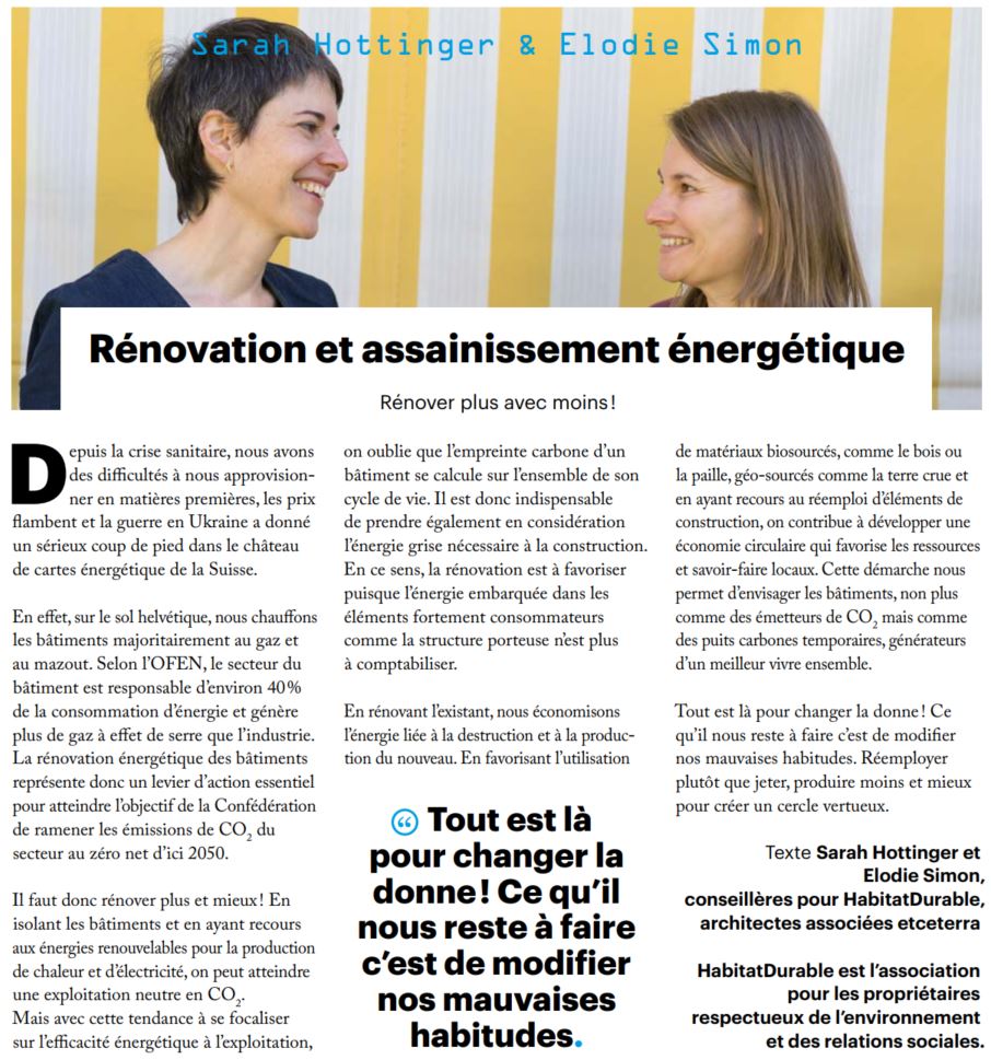 En rénovant l’existant, nous économisons l’énergie liée à la destruction et à la production du nouveau. En favorisant l’utilisation de matériaux biosourcés, géosourcés et en ayant recours au réemploi d’éléments de construction, on contribue à développer une économie circulaire qui favorise les ressources et savoir-faire locaux.