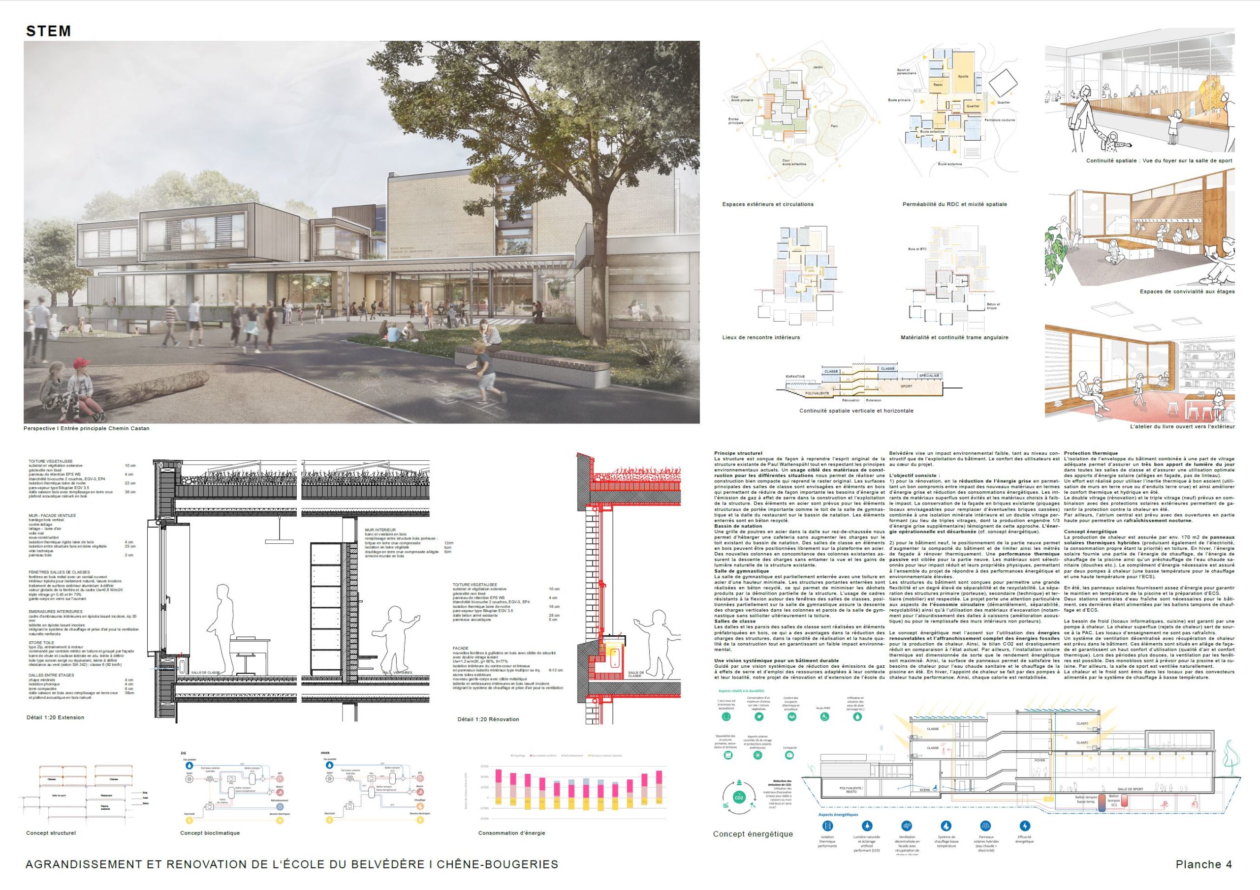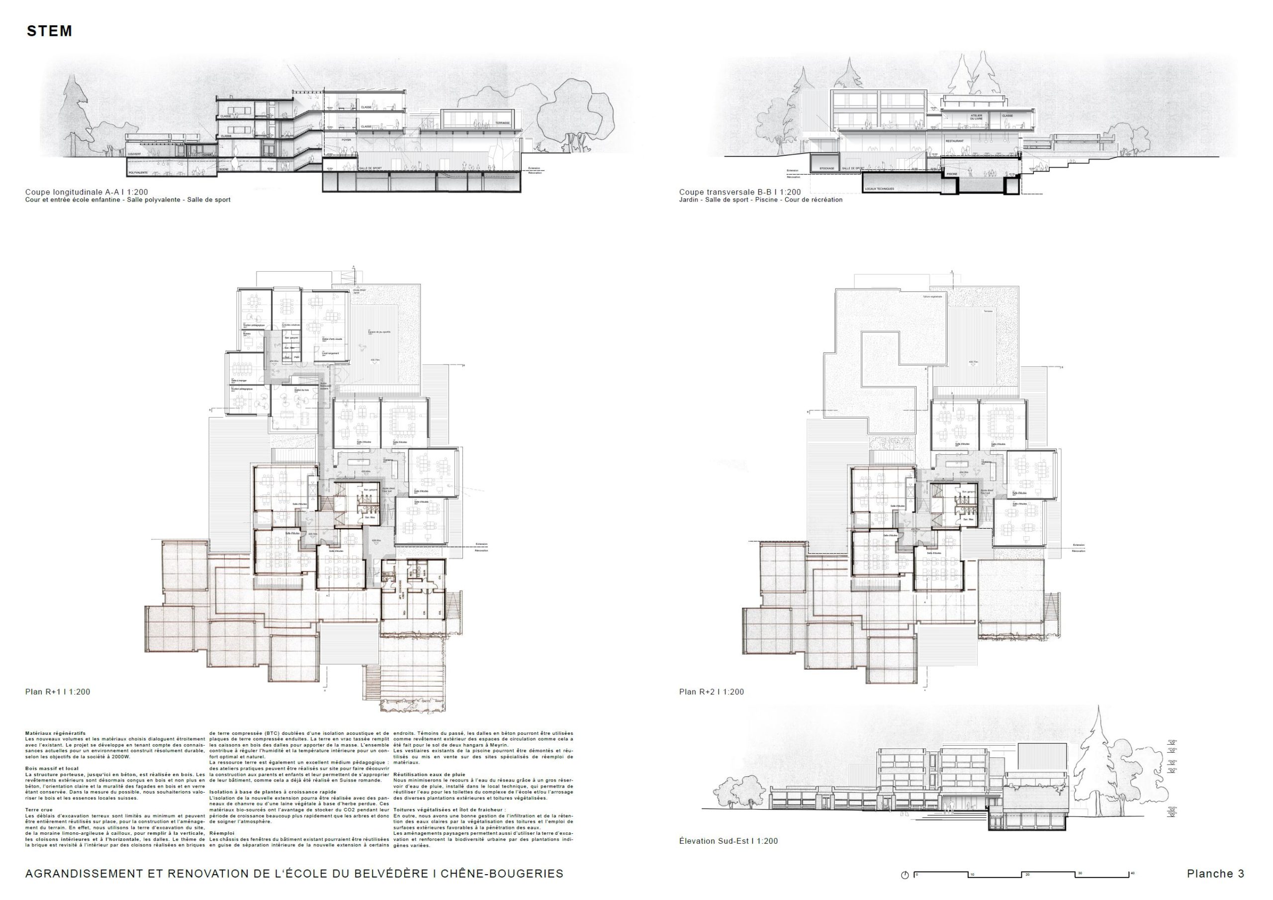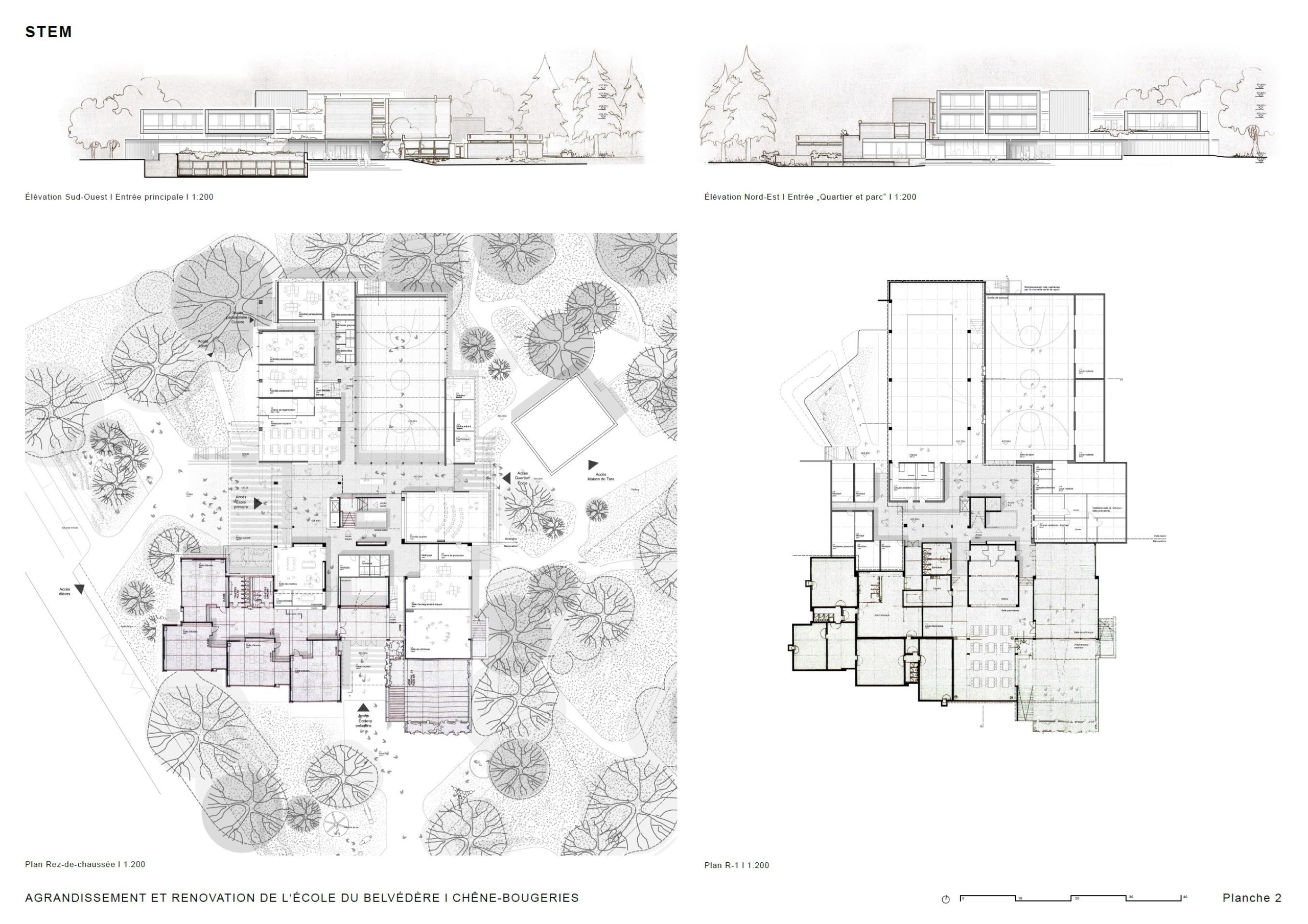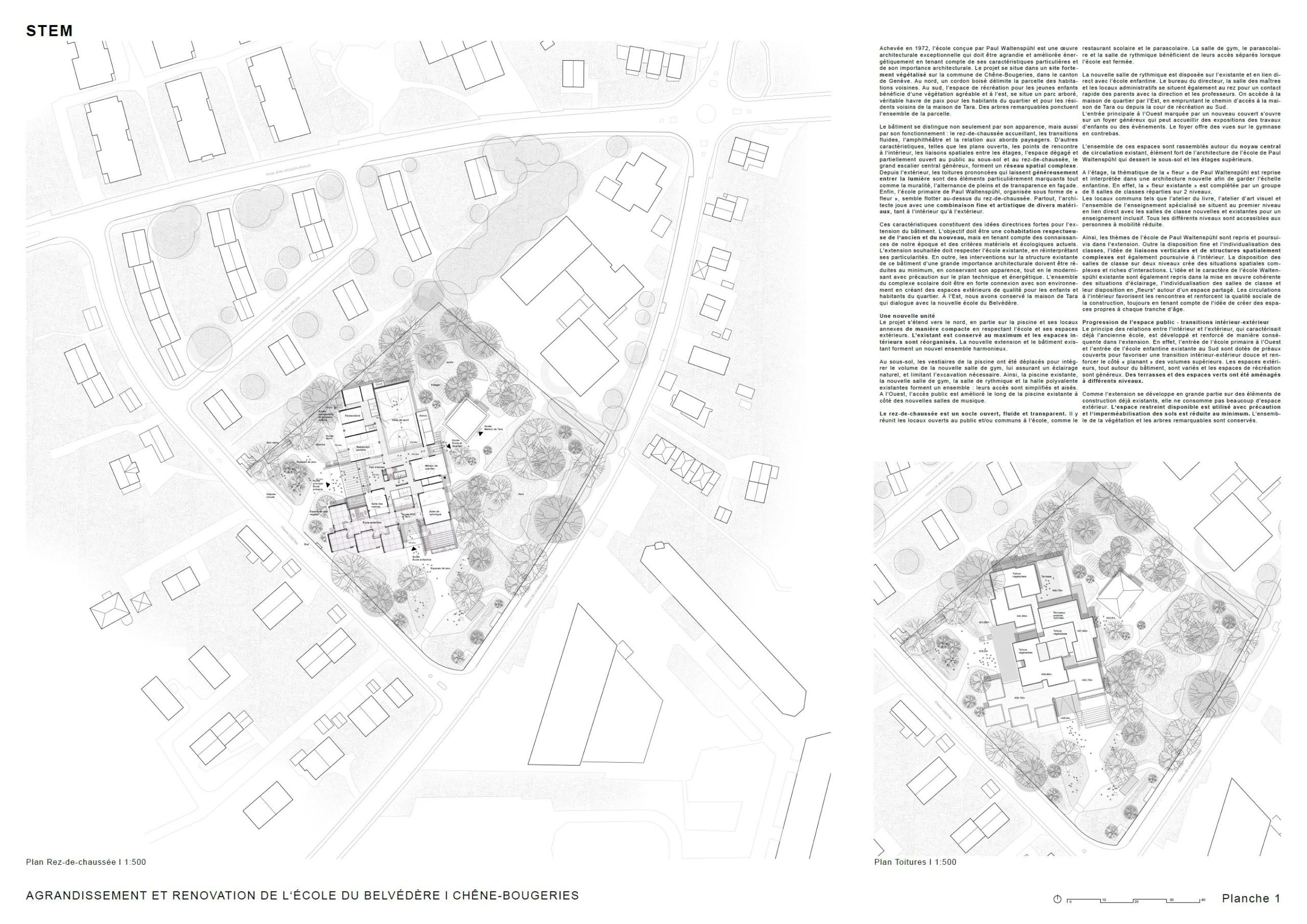 Achevée en 1972, l’école conçue par Paul Waltenspüh fait partie du patrimoine Genevois et doit être agrandie et améliorée énergétiquement. Le projet s’étend vers le nord, en partie sur la piscine et ses locaux annexes de manière compacte en respectant l’école et ses espaces extérieurs. L’existant est conservé au maximum et les espaces intérieurs sont réorganisés. La nouvelle extension et le bâtiment existant forment un nouvel ensemble harmonieux.
