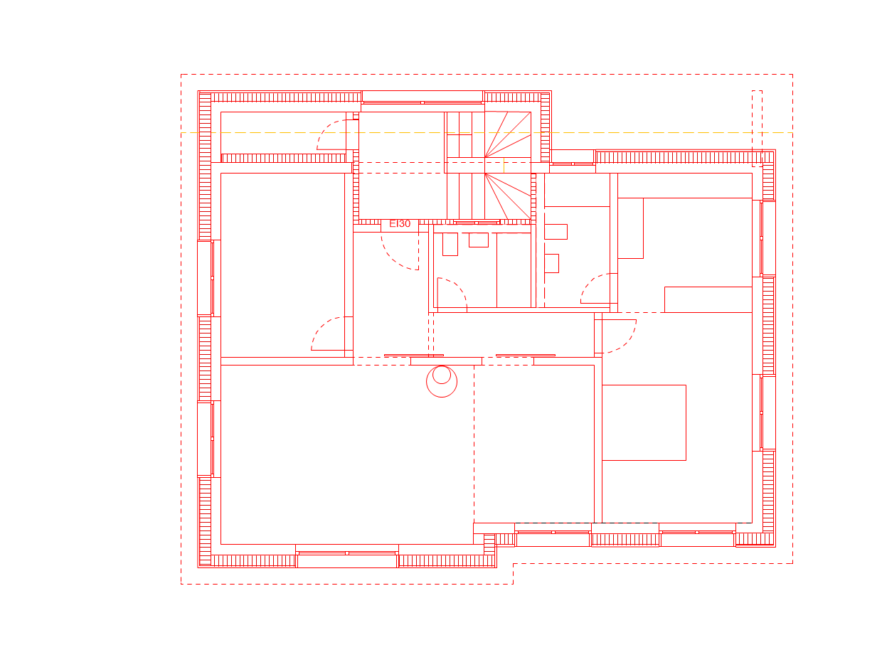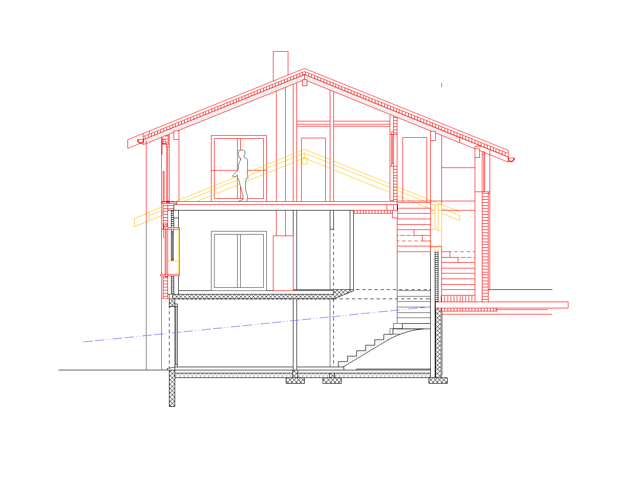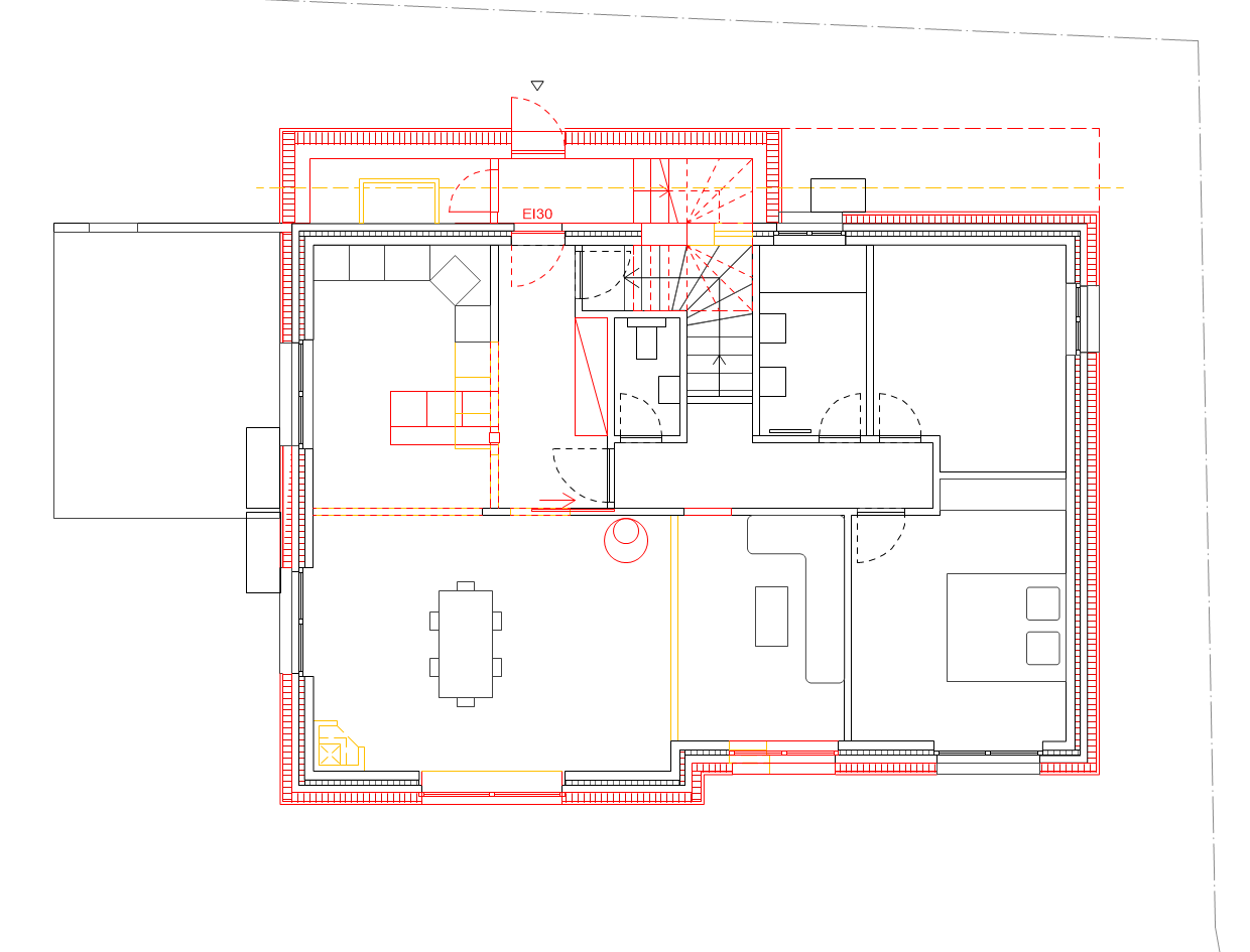 La maison est surélevée afin de créer un deuxième logement à l’étage supérieur. Une nouvelle cage d’escalier prend place au nord. Ainsi, la configuration des étages est flexibles et ces derniers peuvent être rassemblés en un seul logement. Le lieu de vie au rez-de chaussée est réaménagé et l’espace séjour – cuisine devient ouvert. Deux fenêtres sont également agrandies pour bénéficier de la vue sur les préalpes fribourgeoises.
